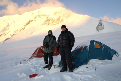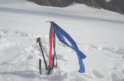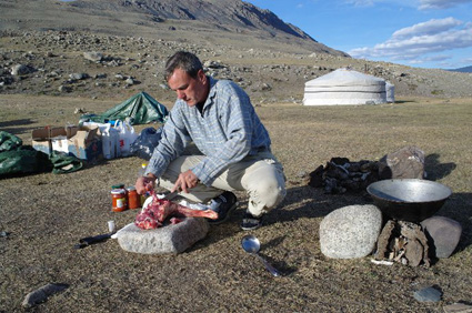 sechste Reise 2011 mit Detlef Ulrich Abd el Kerim im mongolischen und russischen Altai Das Messer begleitete im August 2011 die Harz-Altai-Expedition in die Mongolei und nach Westsibirien. Für die üblichen Verrichtungen, wie steinhartes Brot schneiden oder Ziegenkeulen in Gulasch verwandeln, kam es täglich zum Einsatz (Abb. 1). Bei der Besteigung des höchsten Berges der Mongolei im Tavan Bogd Massiv, dem Khuiten Peak, wurde Abd del Kerim mit ins Höhenlager auf dem Potaniin-Gletscher genommen (Abb. 2 bis 4). Wer sich fragt, warum das Messer mit auf den Gletscher musste, dem sei die Lektüre des Schriftstellers Galsan Tschinag aus dem mongolischen Altai empfohlen. In der ausdrucksstarken Art der Tuva-Nomaden beschreibt Tschinag eine Geschichte um den Gijik, offensichtlich eine mongolische Variante des Yeti, der die Gletscher des Altai bewohnt. Eine Spezialität des Gijik ist der Raub von Menschenfrauen zwecks Genpoolauffrischung. Es stand zu befürchten, dass die Attraktivität unserer einheimischen Bergführerin Ganga auch dem Gijik zur Kenntnis kommen könnte. Abd el Kerim war zum Beispiel beim Eingraben der Zelte in den Firnschnee nützlich, könnte dem Gijik aber auch als Abschreckung gedient haben. Die Wirksamkeit dieser Maßnahme kann man daran abschätzen, dass sich der Gijik während der gesamten drei Tage auf dem Gletscher nicht hat blicken lassen. So konnten wir Ganga wieder wohlbehalten im Basislager abliefern bzw. sie uns. |